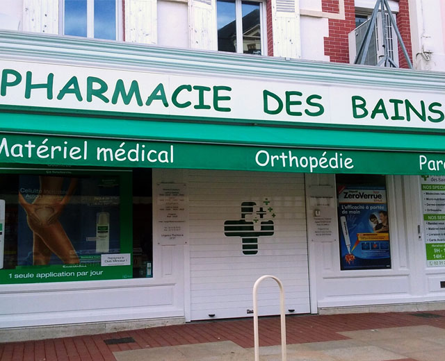 Rolluik model MASTER DEKORA in Ral 9010 voor deze apotheek, Pharmacie des bains in Normandie (Frankrijk).