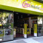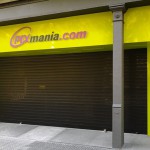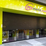 Façade intégrée de la nouvelle boutique Pixmania à Barcelona, avec le système DUET PLUS breveté par Collbaix. L’ensemble (porte automatique + volet métallique) intègre un système LED très attirant. Porte enroulable mod. MICROBAIX Noire + porte automatique URBAN double téléscopique.
