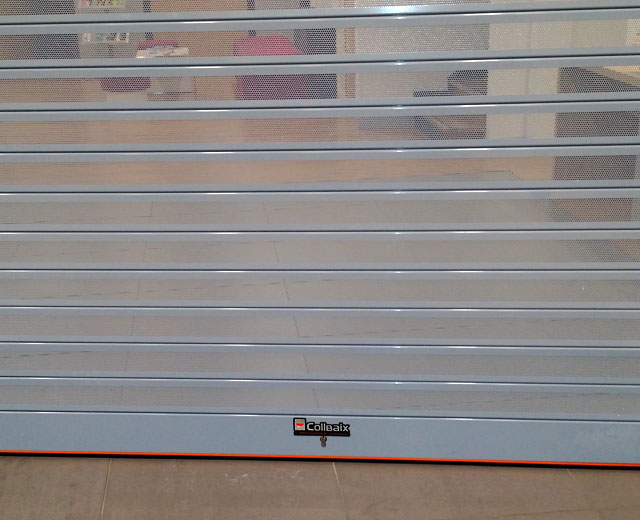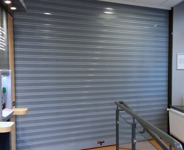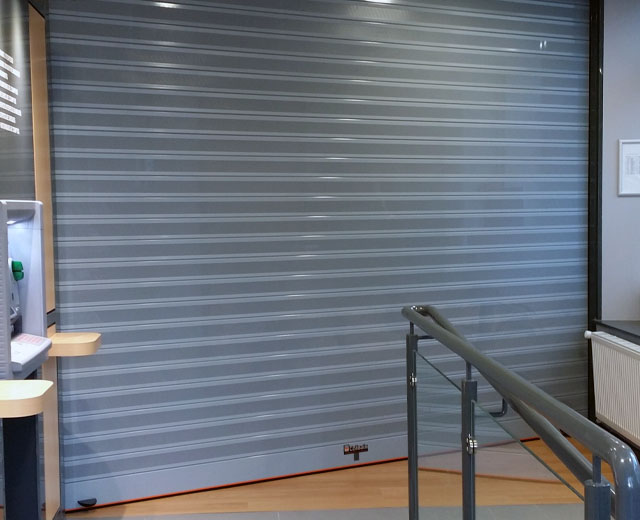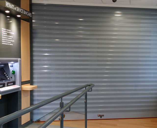 Porte à enroulement modèle MICROBAIX en finition Ral 7001 pour la banque Credit Agricole (France).